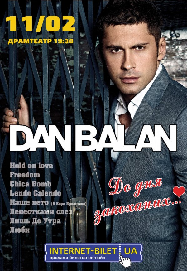 Концерт DAN BALAN состоится 11 февраля 2018 года в Драмтеатре С помощью сервиса internet-bilet.ua, Вы сможете с легкостью забронировать, заказать и купить билеты на интересующий Вас концерт, спектакль, оперу, балет, мастер-классы, спортивные и детские мероприятия, оплатив их самым удобным для Вас способом: через интернет банковской картой VISA/MasterCard, наличными или курьером, если сделаете заказ билета c доставкой.